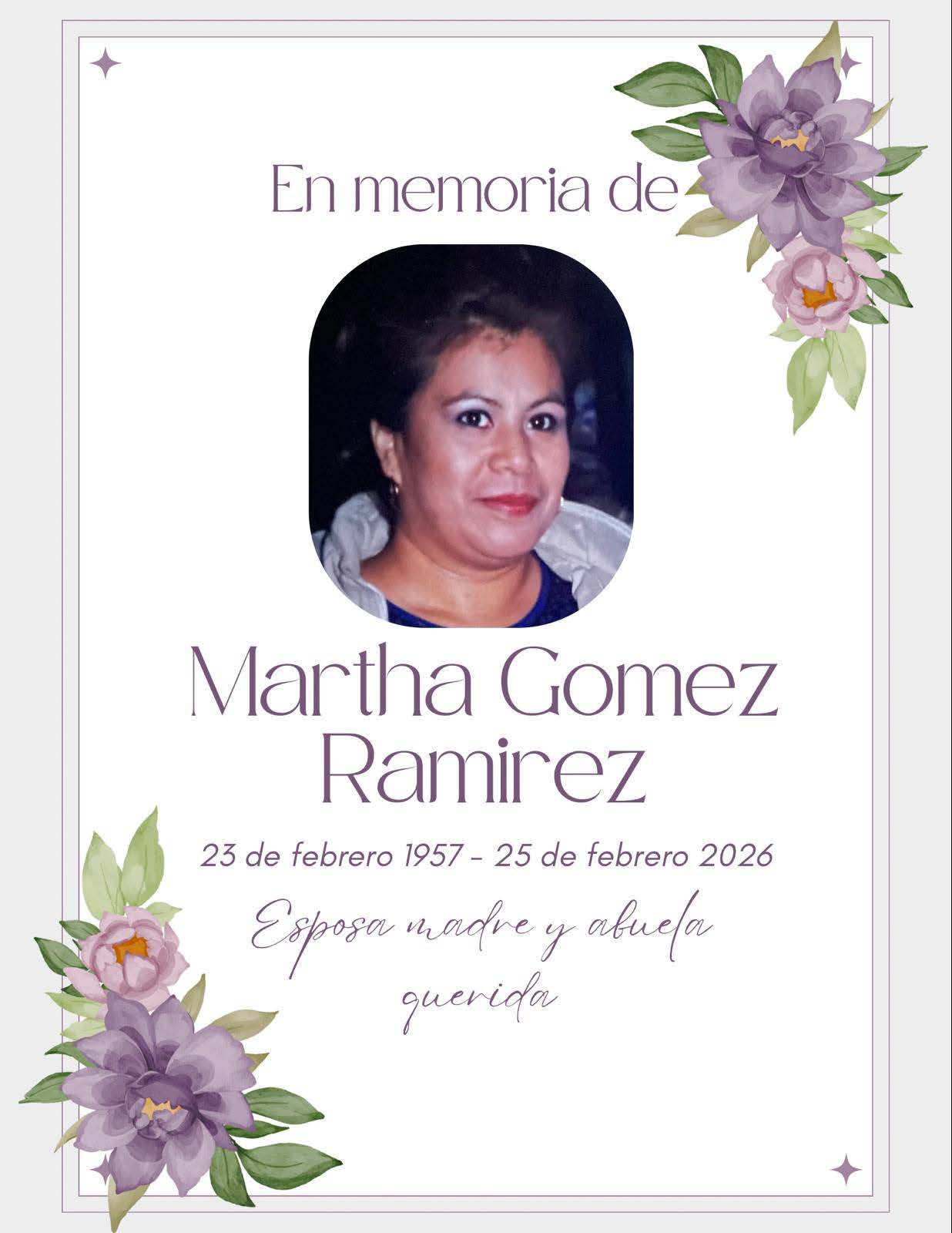 Con profunda tristeza, anunciamos que Martha Gómez Ramírez, de 69 años, residente de Houston, Texas falleció en su hogar el 25 de febrero de 2026. With profound sadness, we announce Martha Gómez Ramírez, aged 69, of Houston, Texas, passed away peacefully at her home on February 25, 2026.