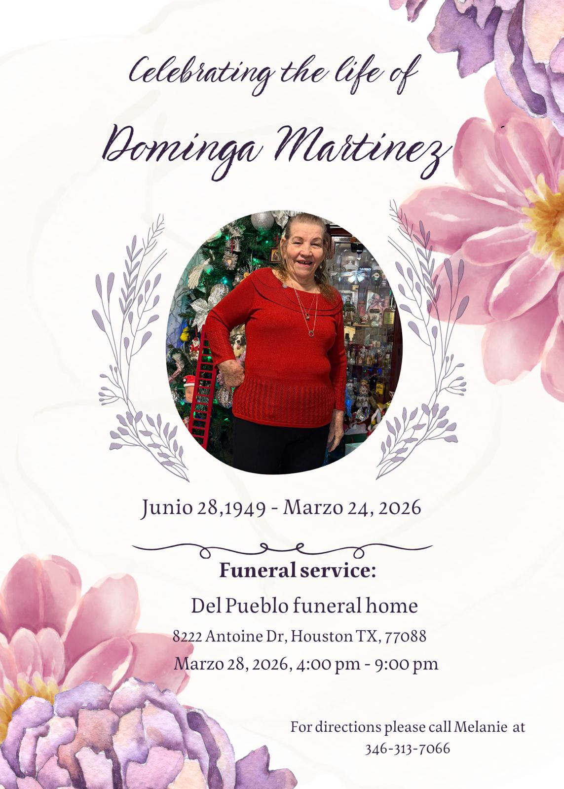 Dominga fue una mujer fuerte, alegre y llena de vida, conocida por su gran corazón y su carácter amoroso. Fue una esposa dedicada a su amado esposo, Manuel Martínez Valdez, quien le precedió en el descanso eterno.